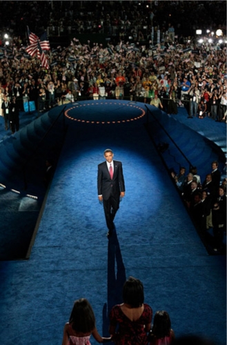 8月28日,奥巴马获得了代表美国民主党参与总统大选的提名。在聚光灯下,他向自己的女儿米拉、萨拉以及夫人米歇尔走去。(图片来源:法新社-盖蒂图片社)