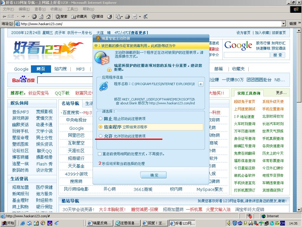 楼主可打开浏览器-工具-Internet选项-在主页地址位置输入sina的网址,之后看看是瑞星的什么功能提出保护界面。