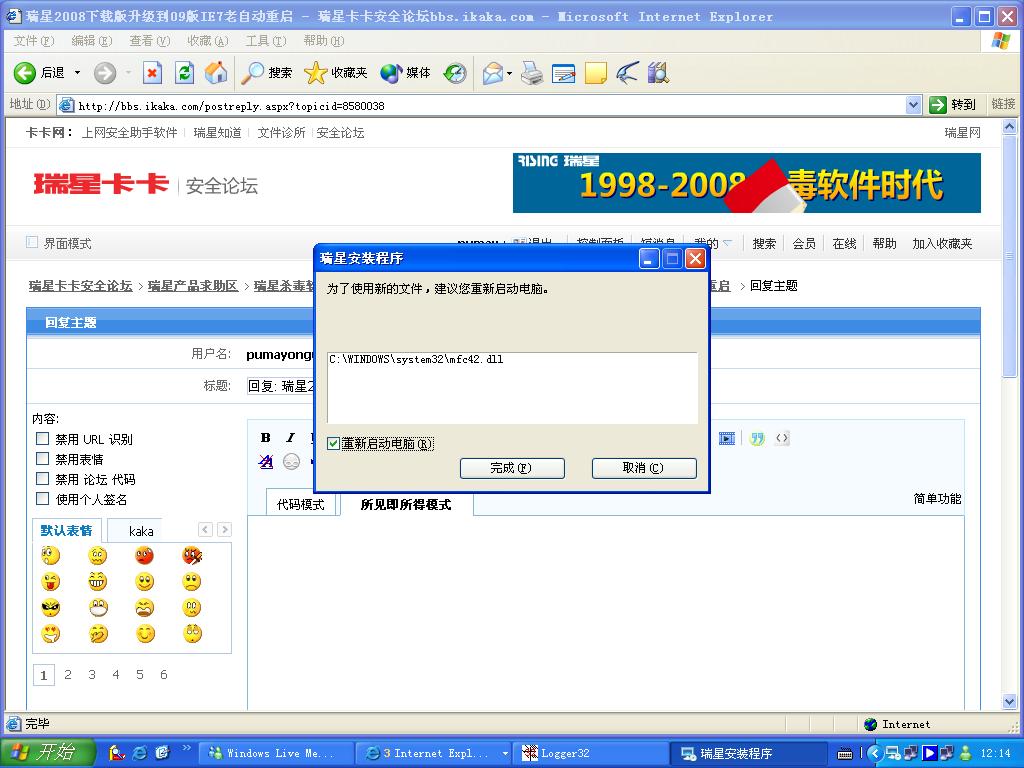 楼主通过卡卡打上系统补丁,现在有病毒利用IE7漏洞进行攻击的。今天瑞星升级我也重启了,不过是因为升级了一个驱动,只能重启,没办法。