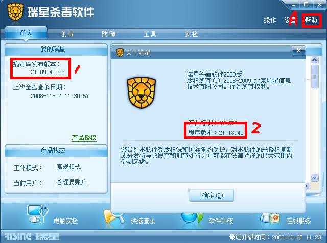 杀软产品当前版本(单击A处,选择“关于瑞星……”后即可查阅)。