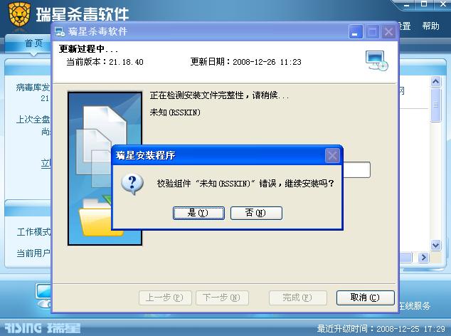 删掉瑞星杀毒软件,重启机器,然后换个安装路径重新安装一下,然后再线升级试试。