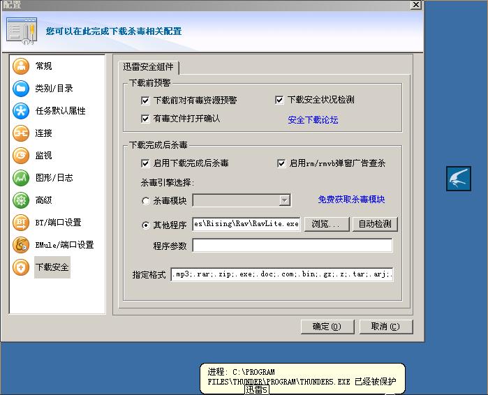 每次下载完回弹出一个对话框让选择,但无讯雷的相关选项.而讯雷中的设置是瑞星的嵌入杀毒引擎程序没错。现在没办法,只有先把迅雷中的下载后自动杀毒的选项关掉,自己手动杀了。