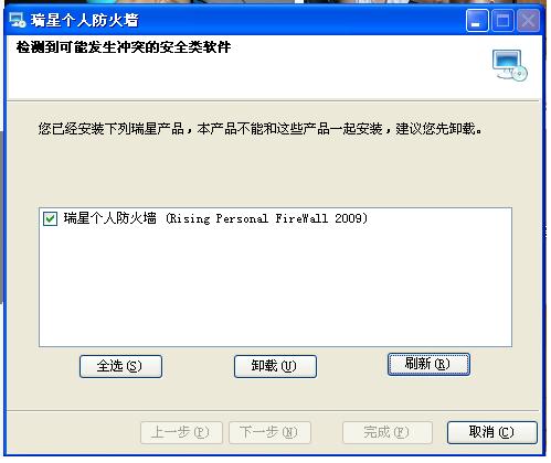 昨晚从08升级到09的(20.×.×→21.×.×),就刚刚前面再次点击智能升级,好象杀毒软件和防火墙都升级到21.18.53了。可杀毒软件能正常升级完毕,在防火墙升级的过程中突然提示,在升级的过程中与本来安装的软件有冲突,建议先卸载,列表中显示是瑞星个人防火墙(RISING PERSONAL FIREWALL),那我就点击卸载了。卸载后建议重启,重启后我本以为既然智能升级总会自己再安装新版本的吧。可重启后,FW倒是卸载了,新版本的FW却不给装了。??????