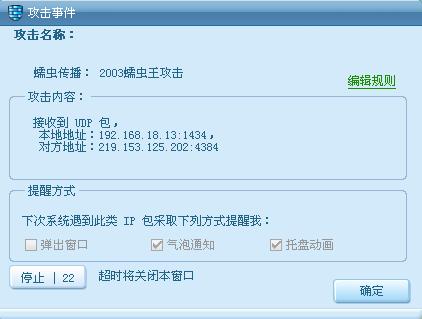 网络攻击拦截->设置,把“2003蠕虫王”前面的勾去掉就不会报警了。
