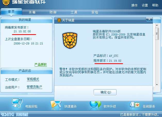 我的瑞星是从2007版本升级上来的。原来一直正常,现在出问题了。如图:我的感觉是病毒库升级了,只是显示上的问题,应该不会有大问题,是这样吗?还是有问题呀,高手支招。谢谢。