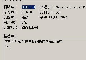 重启 进入安全模式 复制一个beep.sys 进去 从其他机器里面找一个复制进来也可以