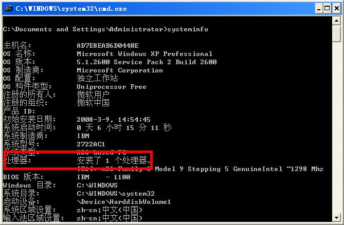 开始--运行--输入CMD--回车,进入命令提示符窗口,输入systeminfo,回车,出现下图: