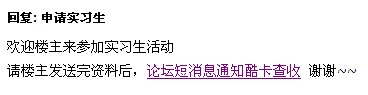 Email:sizhi2006@tom.com QQ:461988547 所学专业:通信技术 自我介绍:想在离校前实践学到的东西,同时学点知识为未来创造辉煌!其他个人资料就不发了,我上次发过 了。:default6: 想着酷卡这样回复: