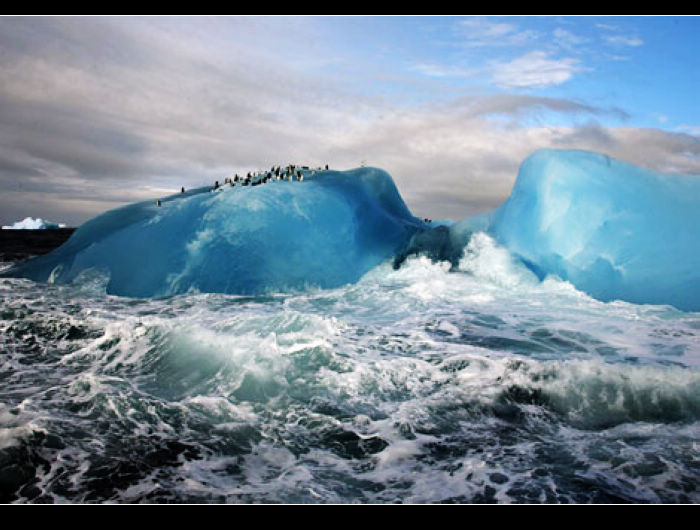 乘高高的海浪登上了南三文治岛内的圣烛节岛附近的蓝色冰山。为了避免受到海豹的攻击,南极企鹅只得到这里来寻求片刻安宁。南极企鹅是盛产于南极洲或亚南极区的第二大企鹅。
