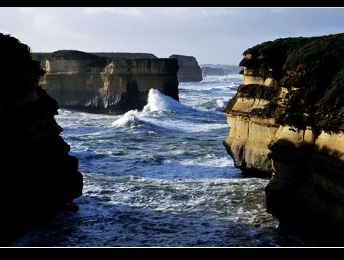 侵蚀的力量在澳大利亚坎贝尔港内的这些石灰石峭壁清晰可见。大约500万年以前这地区曾经是一处石灰石高地,但随着海平面升高,浪花和降雨的冲刷开始雕刻这些壮丽的峭壁,形成堆积和弓形。