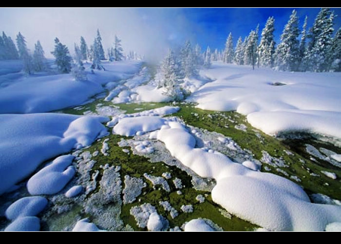 一层厚厚的白雪覆盖在美国黄石国家公园的西大拇指间歇泉上。此公园的间歇泉数量超过世界任何其它地方。