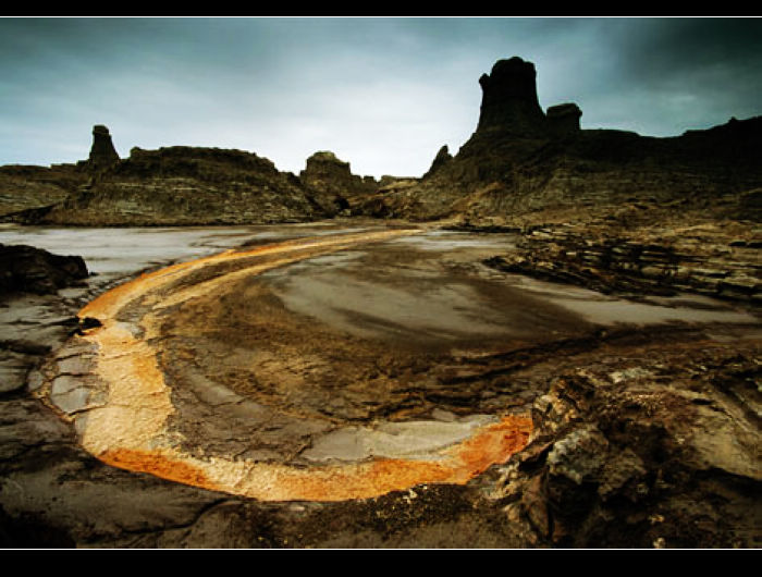 在埃塞俄比亚丹纳奇尔(Danakil) 沙漠,盐塔和河床被结晶盐加上了色彩,形成了超凡脱俗的一道风景。的来自的制造一个来世的风景画位于Danakil沙漠。在海平面之下90多米处,其温度达到华氏120度(摄氏49度),当地居民珍惜丹纳奇尔的惟一东西:那就是盐层。