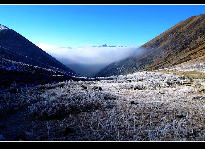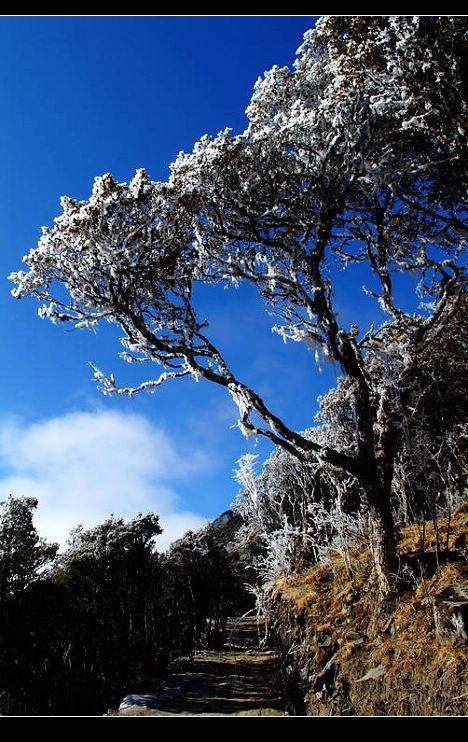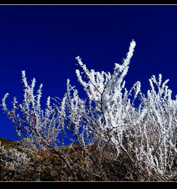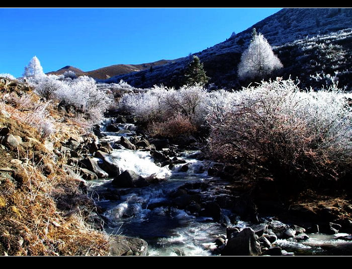 像一片秋天掉落的叶子,我四处飘荡,不经意之间闯入冬天的怀里。一夜大雪释放了蕴藏在川西大地中的所有激情,雪山上、森林里、小村旁无处不铺满了厚厚的冰雪。每到一处,眼前都会忽然一亮;每走一步,心灵都有一种强烈震撼的感觉。草木经过银白色雪花的勾勒,在黎明微微蓝色的印衬下,显得格外的美丽。穿梭在冰天雪地之中,似乎走进了梦中的童话世界,让人时时感觉惊喜不断……