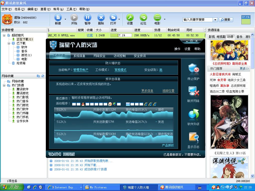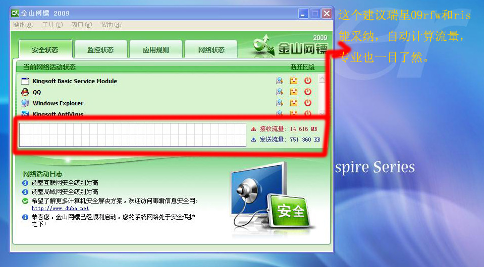 如图所示,我在下载东西,我家里的带宽是3MB,用下载软件下载速度在298Kb左右,但打开瑞星防火墙却看到接收高峰值在853Kb,853Kb就相当于是8MB的带宽,这怎么可能,我家宽带限速在3MB,是直线宽带,不是小区局域网宽带,所以不可能出现这数据,希望瑞星改进一下数据统计,其次希望瑞星的流量计算更精确一点,建议可以参考金山2009的网镖,其次金山网镖的数据统计会自动换算单位,一旦慢了1024Kb就会自动计算成1MB,满了1024MB就会计算成1GB,希望瑞星计算方式上也有所改进,希望能采纳,谢谢!