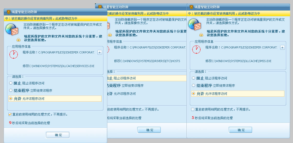 我的机器上装有diskeeper,设置了自动整理碎片。但是瑞星总是提示访问是否允许对话框,烦死了,怎么设置啊?