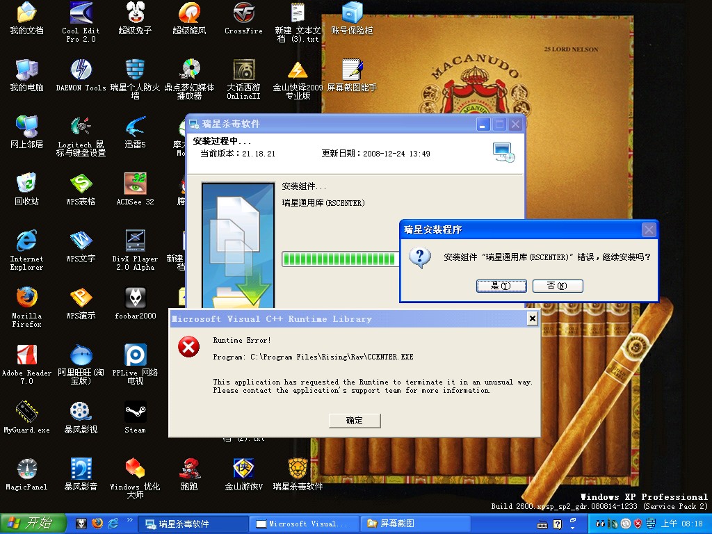 昨天很正常,就是上班前让母亲玩了会,但是我走之前已经把网络断开了,关机没问题,正常关机。结果今天开机时扫了半天硬盘没起来,第2次开机连WINDOWS滚动条画面也没看到,第3次开了却提示什么C++错误,修复,升级,重装都有如下提示,系统使用正常,没感到有什么不适。