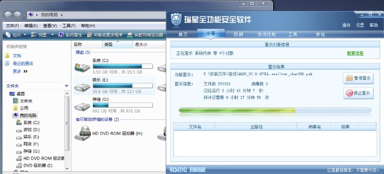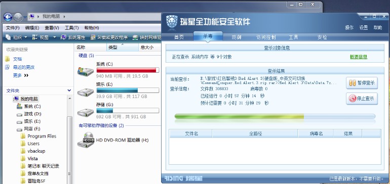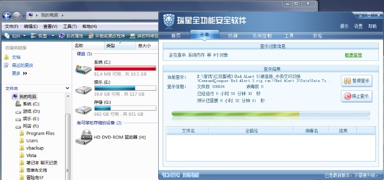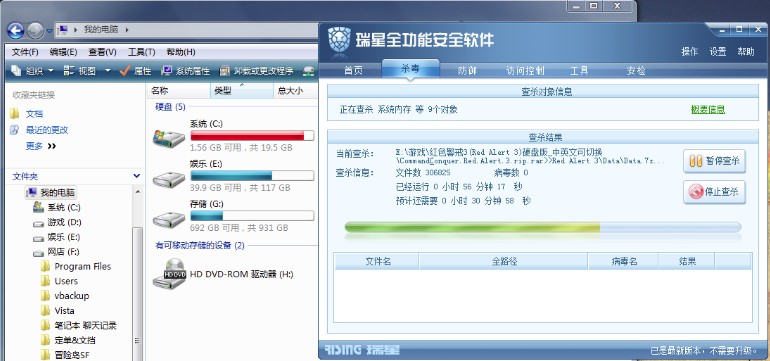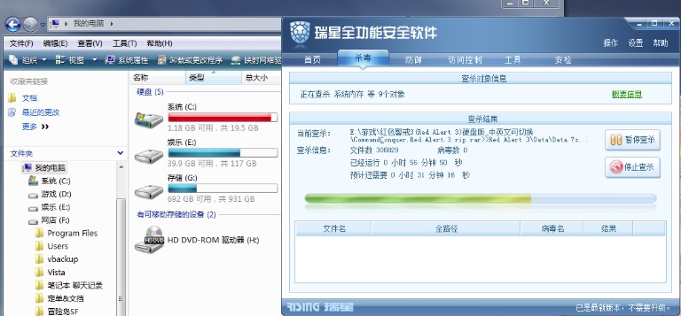 全盘杀毒到50%-60%,C盘就没空间了,只剩几十M,杀毒的速度也很慢,停止查杀C盘空间就恢复了。机器应该是没有病毒和木马的,我是打齐了所有大大小小补丁的。还有浏览网页也是图片打不开,网页错位的问题比较严重,刷新多次才能稍微正常,大部分时间我都要关闭所有监控才能正常上网,:default3: ,装了等于不装??系统是Windows Vista Home Premium SP1 ,IE7,瑞星2009全功能版