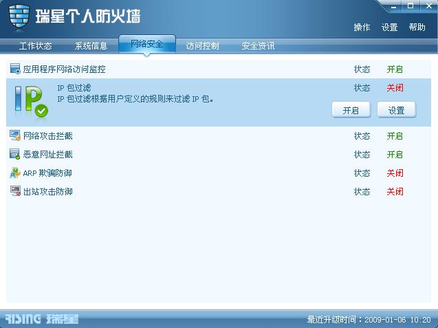 升级2009版后,局域网里的其他人都上不了网吖! 但是把 IP包过滤 那一项 关闭以后 别人就可以上网了! 这是 因为我家上网是路由共享的!我是主线,要用 p2pover 这个软件 控制每条线的速度! 原来2008版的 一直不会与 p2pover 这软件起冲突!升级2009版 后 就不行了!本想 关闭了 那个 IP包过滤 就没事了!但是 电脑重启以后,那项功能 又自动开启了!
