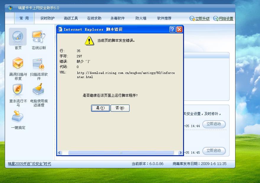 每当启动瑞星卡卡时,就提示“当前页的脚本发生错误”。
