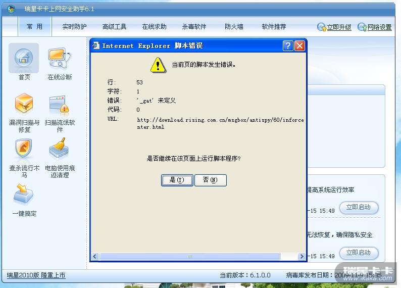 查看完整版本: 启动瑞星卡卡时提示“当前页的脚本发生错误”