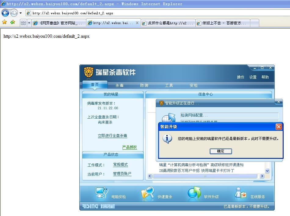 客户反应点击包含javascript的链接后,页面直接跳转当前页,后来确认,确实是客户机升级瑞星杀毒软件,目前客户要求解决,我除了让人家别用IE外没有别的办法了。在百度、谷歌上搜索“瑞星 javascript”,发现已经N多关于瑞星升级导致javascript脚本错误的BUG文章了。瑞星技术人员,快点出补丁,万分期待!!!!!!!!!!!!!!!