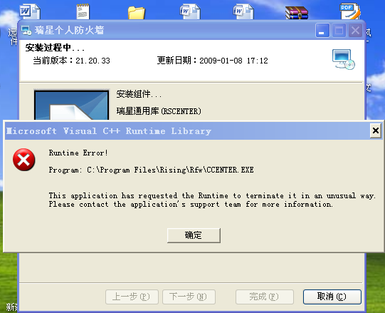 尝试将防火墙安装目录rfw\update下的mfc42.dll,mfc71.dll文件复制粘贴到rfw下,查看是否正常。