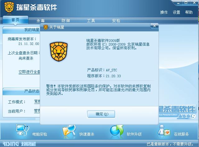 楼主提供一下瑞星当前版本以及操作系统类型。