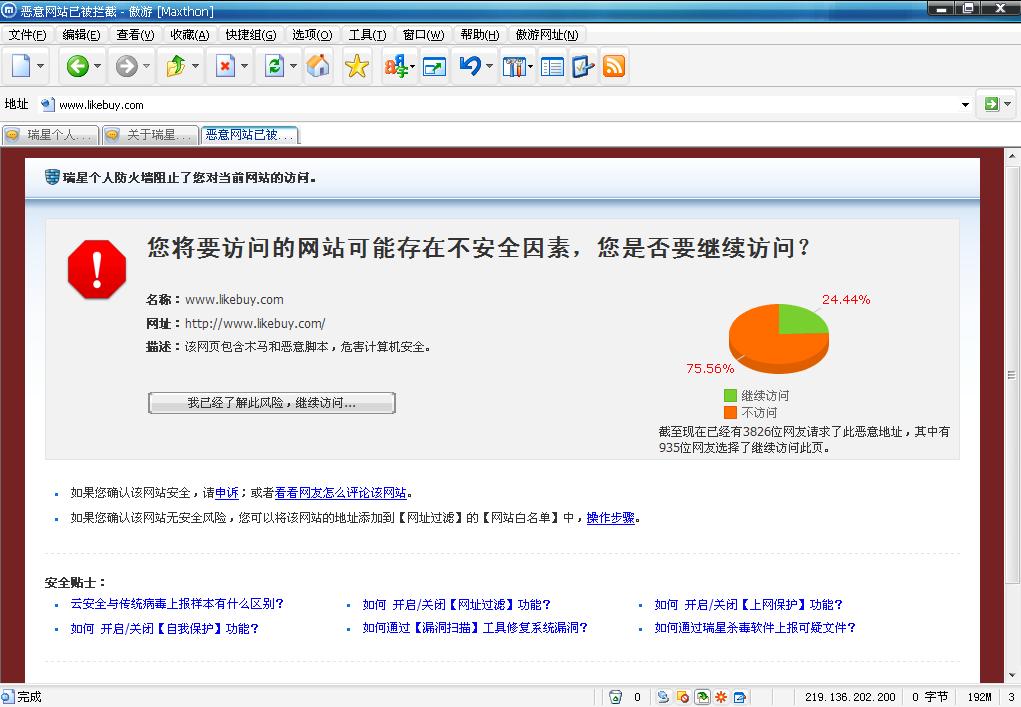 有一个购物网,平时我都有上开的,一直很好.今天由08.12月的版本更新到09版瑞星后(杀软、防火墙) 再上那个网却弹出瑞星的网页.提示该网页存有外挂毒马. 这恶意网站就不能上了. 我觉得这网站应该没问题. 是09版的瑞星太敏感. 是因为哪里设置出了问题吗? 还是这网站真的有病毒. 下面是那提示网页的一张图片