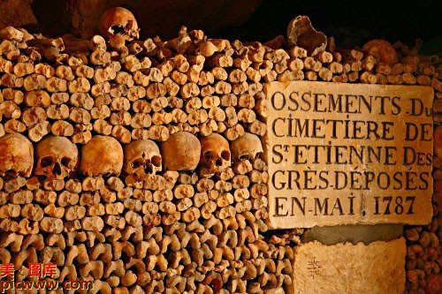 第6.6.法国巴黎的地下墓室:延绵178公里的地下隧道,埋葬了约700万人,骸骨都整齐沿墙排列,并标明死亡年份。墓室里的空气非常干燥,弥漫着尸体腐烂的味道。墓室本是石灰岩矿场,后因墓地爆满兼疾病爆发,于18世纪70年代开始葬人。