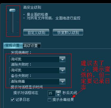 1.“清除病毒失败时选择”:删除文件,可以减少手工操作,但是选择为“询问我”,会减少潜在的损失