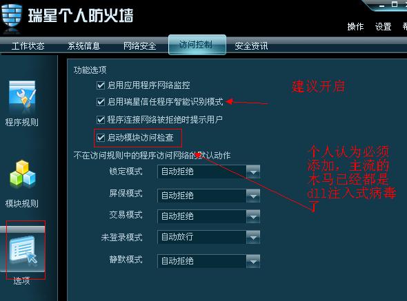 按这个改了下,觉得电脑用起来变得麻烦很多。我在这里先鄙视一下acbd,说自己是菜鸟。那规则让我们用起来就像是在用卡巴,对我们这种真正的菜鸟是巨大的折磨。你加强了那么多保护,结果菜鸟我对每次报警都点允许,不等于白费。瑞星的易用性是它的大优点啊,所以建议再出个超级菜鸟规则组合,方便我们使用。