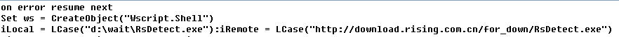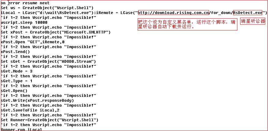 我曾经下过一个脚本,一运行这个脚本,08版瑞星网页监控就报是木马下载器。最近我把这个脚本从病毒隔离区恢复并运行,09版瑞星没有任何反应。这个脚本就是从一个网址下载程序到本地并运行。我用瑞星听诊器的链接作的试验。瑞星听诊器得以运行,没有任何提示。这里给出部分代码。