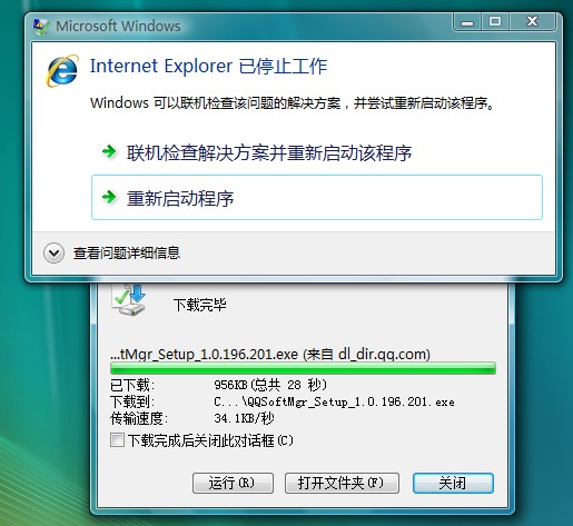 下载完成就会出现系统错误! ie已停止工作,如果关闭 使用OFFICE/IE 镶入杀毒!那么下载正常!