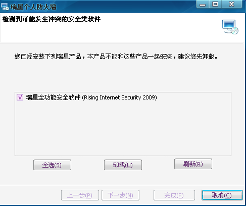 你安装了瑞星的全功能软件,已经把杀毒和防火墙结合在一起了,不需要再单独安装杀毒和防火墙。