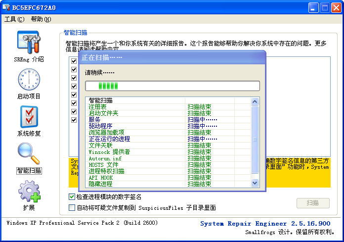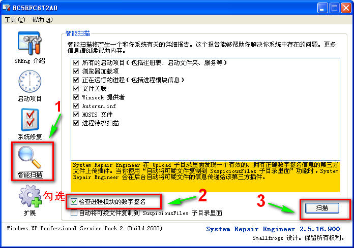 点击下载 System Repair Engineer (sreng) 解压后运行 mySREngLdr.com 按下图操作来进行扫描