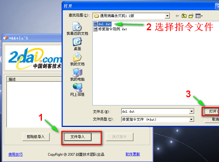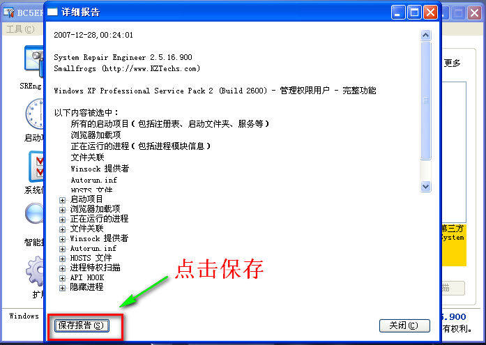 扫描结束后 点击保存报告 并把生成的SREngLOG.log 在你的帖子中以附件形式上传到论坛三.使用“通用病毒杀灭机”杀毒 (vista系统请看3楼) 等技术人员分析完你的报告后,把给你的杀毒指令文件(del.dat)下载下来 导入“通用病毒杀灭机”(压缩包里的mybox.com)进行杀毒。 点击下载通用病毒杀灭机注意: 使用杀灭机请先手动更改系统时间为2007年12月20日,或点此下载软件自动设置 系统时间为2007-12-20. 更改好时间后再按下图进行操作!