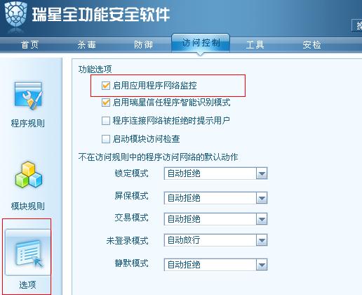 买了没多久的“瑞星全控能安全软件”,第一次设置的时候将防御中的所有监控都开启了。有一天打开看的时候,发现“应用程序网络访问监控”和“IP包过滤”都关闭了,我也不知道怎么回事,我就打开了,等我再次开机的时候,那俩个还是关闭。我不清楚这两个监控对上网有多大的影响,但是经常这样是不是就有问题了?
