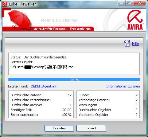 大哥 您看看清楚 avira发现了7个 2个可疑。。。。。