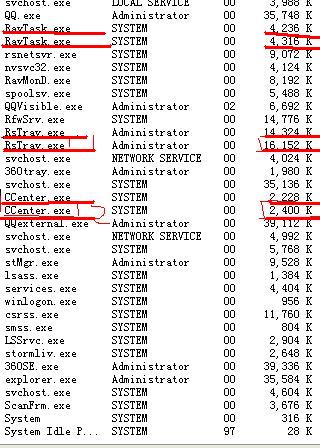 这几天突然出现不能关机或重启,看看任务管理器才发现了问题,下图中出现了三个重复的瑞星进程,rstray.exe、ravtask.exe和ccenter.exe,结束进程后就可以关机或重启(每项只能正常结束一个)