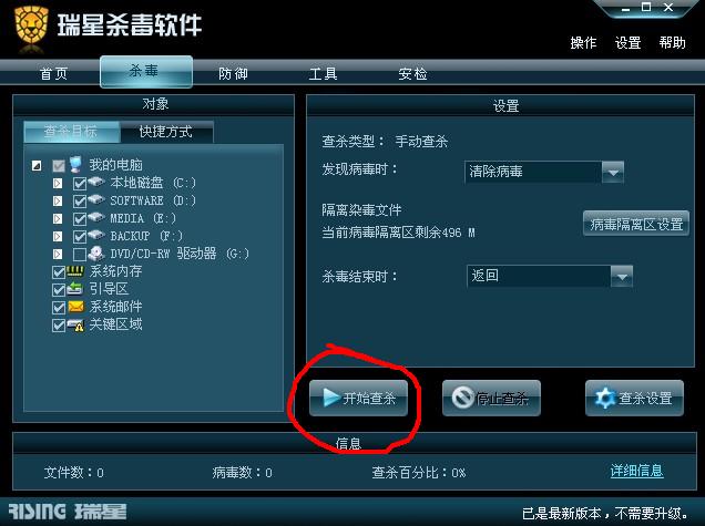 打开瑞星杀毒软件2009,选择“杀毒”选项卡,点击“开始查杀”即可。