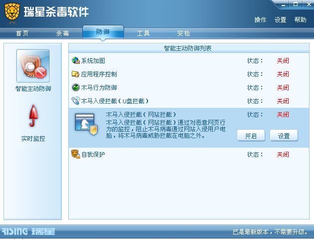 家里的电脑,N久没有升级了,最后升级是08年10月份,于是乎点升级!升级安装过程中出现错误,说什么RAVMON.exe无法启动,是否继续?没有理它,于是继续,安装完成后重新启动,绿色瑞星小雨伞变成红色!所有的防御处于关闭状态,于是乎想手动启动防御,无法启动!