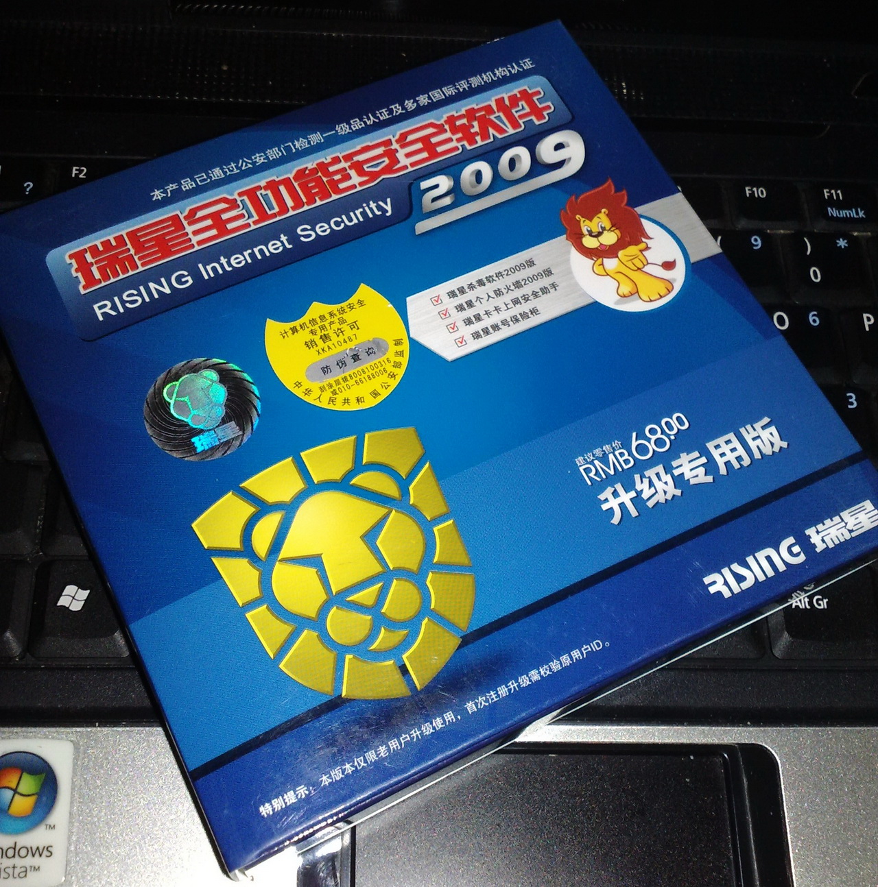 今天总算收到了瑞星全功能软件2009版专用升级版,68的53搞定,还算不错。