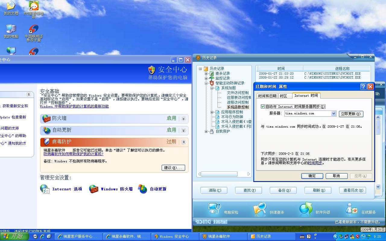 前段时间从网上下载了一个visual basic 6.0的程序(盗版的:default7: ),作为学习之用,没过几日瑞星发出了有SVCHOST.EXE修改系统时间的警告。我当时采取了阻止,有过了没多长的时间widows安全中心提示杀毒软件过期。刚开始我怀疑是系统时间被更改了,可是检查电脑右下角的时间图标时间是正确的。同时也对internet的时间进行了更新和重启了计算机,此现象依然没有能够解决!在这里上传一张现象的截图,还望大家帮忙看看到底是怎么回事情。在这里,现谢谢大家了!