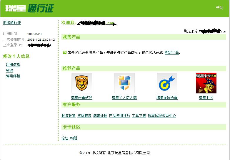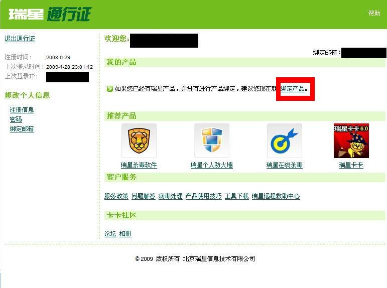 瑞星官方网站-右上角瑞星通行证-绑定瑞星后就可以看了