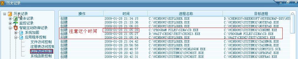这个测试程序后台在C:\Program Files\sina创建cd.exe,note.exe,ok.vbs,vivimin.dll这四个文件,然后运行cd.exe.我的规则是监控创建目录名包含c:\进程。所以这个程序在创建文件时不被报警,但是运行cd.exe时,触发规则,瑞星行为检测报警。但是我在看提示时,到了倒数7秒时,cd.exe启动了。我点仅放过文件时,cd.exe退出。