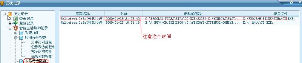 这个规则是API规则,创建进程的这么一个规则。理所当然被启动进程(本例为C:\Program Files\sina\cd.exe)应该在我做出选择后再按相应选项反应。另外木马行为检测没有放行选项,只有加入信任名单一项。而且选加入白名单仍然被启动进程退出。