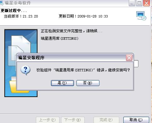 “检验组件“瑞星通用库(setings)”错误,继续安装吗? ” 这个对话框!!