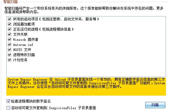 SREng打开后点智能扫描.勾选检查进程模块的数字签名,点扫描.把日志以log日志导出并作为附