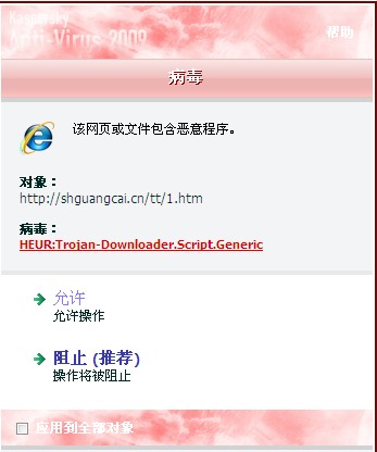 2009-01-31 11:01:06 http://shguangcai.cn/tt/5.htm Internet Explorer 检测到威胁: HEUR:Exploit.Script.Generic 2009-01-31 11:00:43