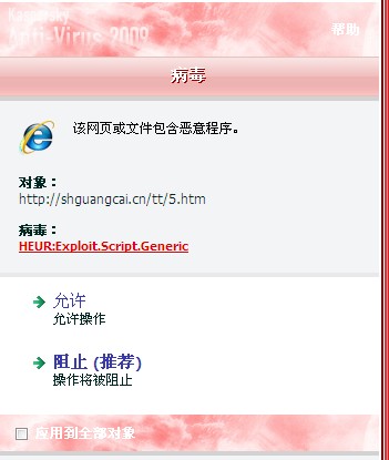 2009-01-31 11:01:06 http://shguangcai.cn/tt/5.htm Internet Explorer 拒绝: HEUR:Exploit.Script.Generic